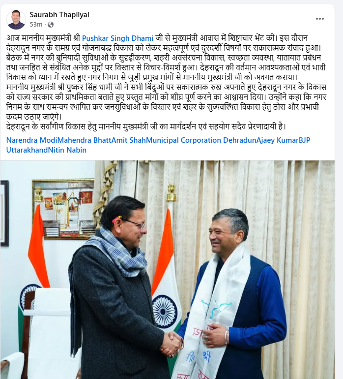 देहरादून के मेयर सौरभ थपलियाल ने सीएम धामी से आज शिष्टाचार भेंट की। इस अवसर पर देहरादून नगर के समग्र विकास से जुड़ी विभिन्न योजनाओं, बुनियादी सुविधाओं के सुदृढ़ीकरण, शहरी अवसंरचना, स्वच्छता, यातायात व्यवस्था तथा जनहित से संबंधित महत्वपूर्ण विषयों पर विस्तार से चर्चा की गई।
