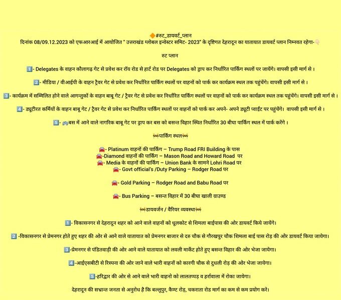देहरादून – 8 व 9 दिसंबर को एफआरआई में आयोजित इन्वेस्टर्स समिट को लेकर पुलिस ने रुट डाइवर्ट प्लॉन जारी कर दिया है ये रहेगा रुट...