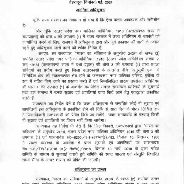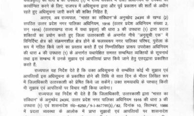 देहरादून – शासन ने नगर पंचायत पुरोला और कालाढूंगी को नगर पालिका का दर्जा देने की अधिसूचना जारी कर दी है। मुख्यमंत्री पुष्कर सिंह धामी ने...