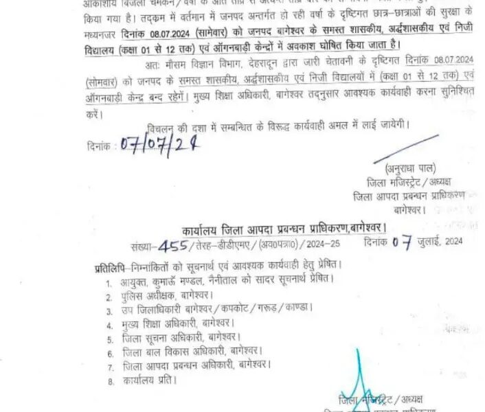 बागेश्वर – भारत मौसम विज्ञान विभाग, देहरादून द्वारा दिनाँक 07.07.2024 को अपरान्हः 01:30 बजे जारी मौसम पूर्वानुमान के अनुसार जनपद बागेश्वर अन्तर्गत कहीं-कहीं भारी वर्षों तथा...