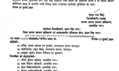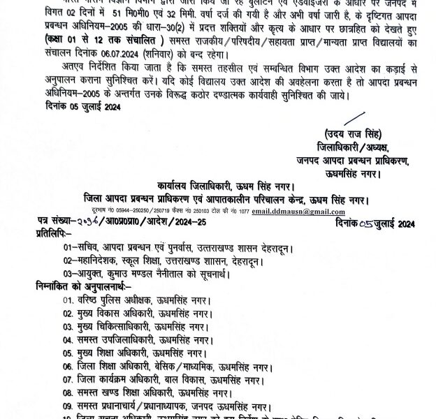 उधम सिंह नगर – उधमसिंहनगर में भारी बारिश के चलते 5 जुलाई से 9 जुलाई तक 1 से 12 तक के सभी विद्यालय व आंगनबाड़ी केंद्र...