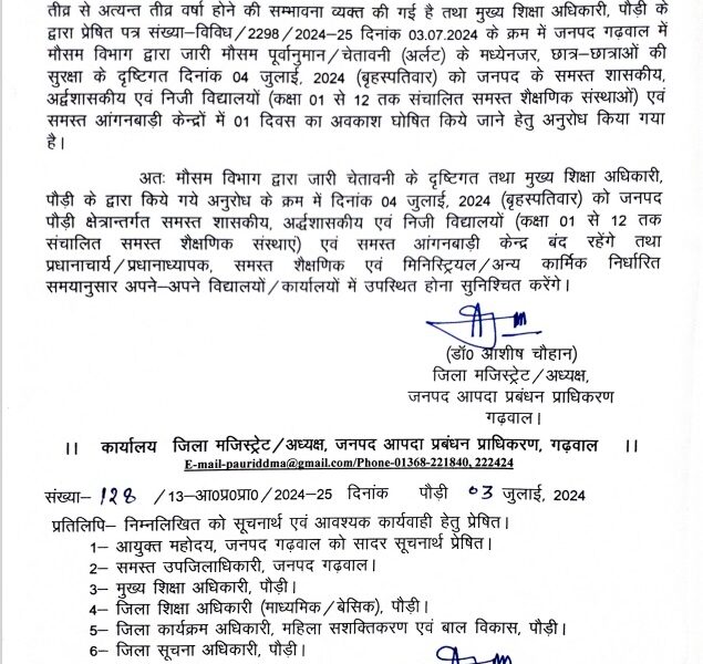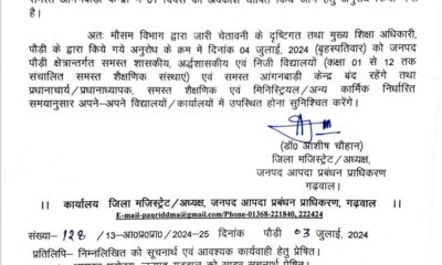 पौड़ी। जनपद पौड़ी में भारी बारिश के अलर्ट के बाद कल कक्षा 1 से 12 के सभी विधालयों व आगनबाडी केंद्र रहेंगे बंद। जिलाधिकारी ने एक...