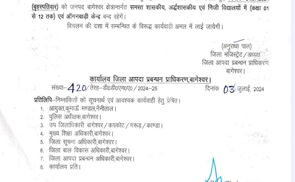 ब्रेकिंग बागेश्वर। जनपद बागेश्वर में भारी बारिश के चलते चार जुलाई को 1 से 12 तक के सभी विद्यालय व आंगनबाड़ी केंद्र रहेंगे बंद। छात्र छात्राओं...