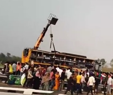 लखनऊ में पूर्वांचल एक्सप्रेसवे पर पलती डबल डेकर बस