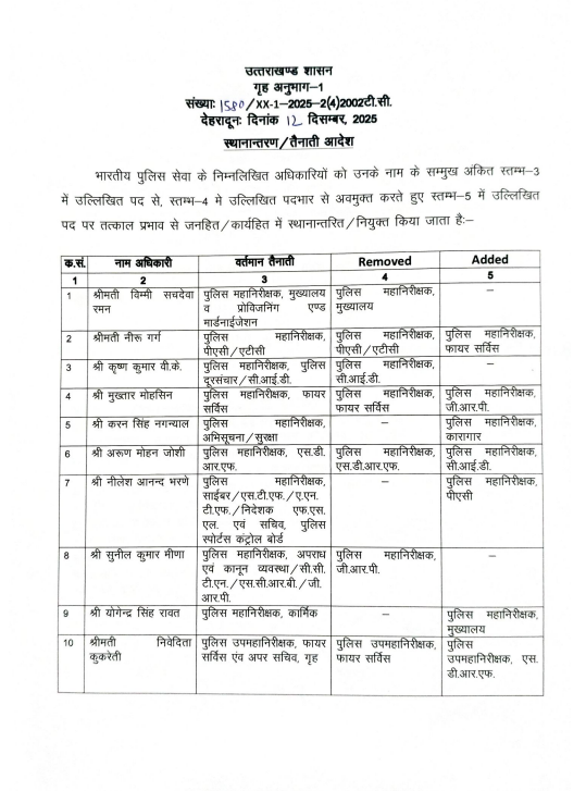 उत्तराखंड शासन से आज की बड़ी खबर, आईपीएस अधिकारियों के हुए बंपर तबादले, देखें लिस्ट