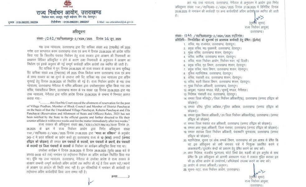 देहरादून: राज्य निर्वाचन आयोग ने कोर्ट के अग्रिम आदेश तक राज्य में होने वाले पंचायत चुनावों के नामांकन और आगे की कार्यवाही को स्थगित किया। प्रदेश से आदर्श आचार...