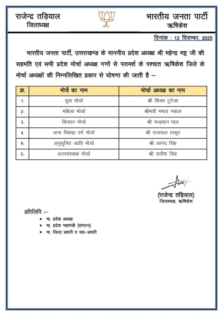 Uttarakhand BJP ने की ऋषिकेश के मोर्चा अध्यक्षों की घोषणा