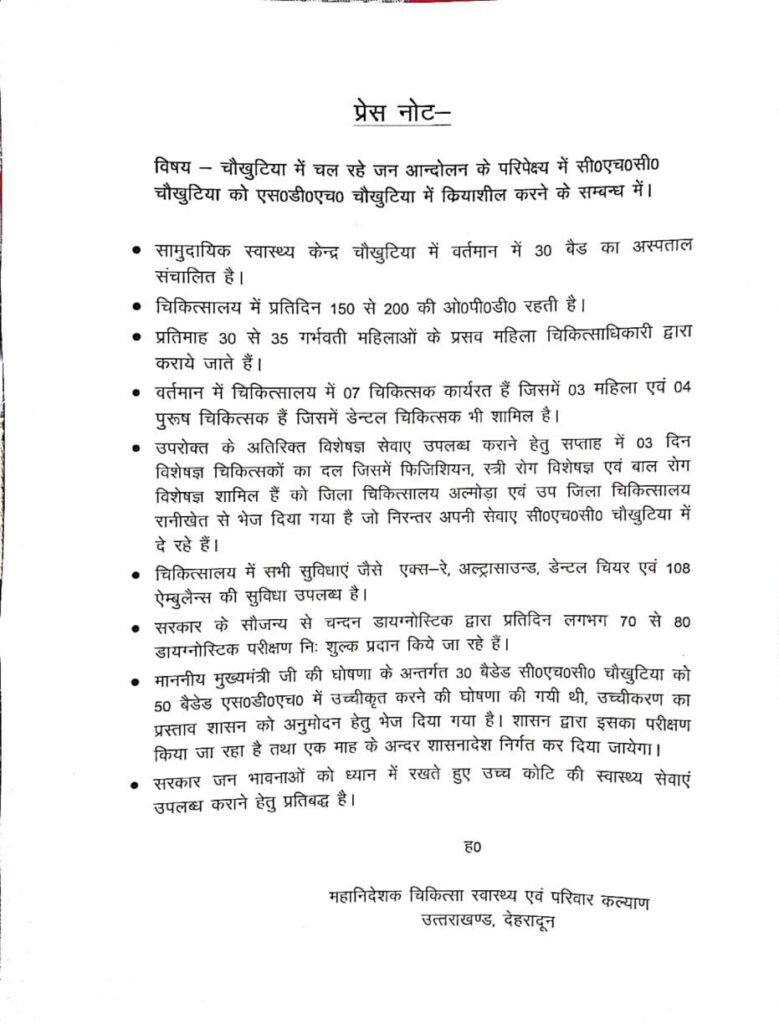सरकार जन भावनाओं को ध्यान में रखते हुए उच्च कोटि की स्वास्थ्य सेवाएं उपलब्ध कराने हेतु प्रतिबद्ध है। इस संबंध में महानिदेशक चिकित्सा स्वास्थ्य ने जानकारी दी है कि सामुदायिक स्वास्थ्य केन्द्र चौखुटिया में वर्तमान में 30 बैड का अस्पताल संचालित है तथा चिकित्सालय में प्रतिदिन 150 से 200 की ओ०पी०डी० रहती है इसके साथ ही प्रतिमाह 30 से 35 गर्भवती महिलाओं के प्रसव महिला चिकित्साधिकारी द्वारा कराये जा रहे हैं एवं वर्तमान में चिकित्सालय में 07 चिकित्सक कार्यरत हैं जिसमें 03 महिला एवं 04 पुरूष चिकित्सक हैं जिसमें डेन्टल चिकित्सक भी शामिल है।