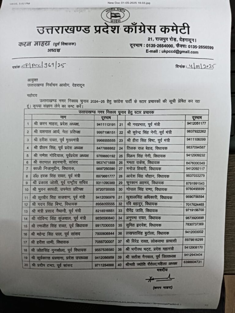 इस सूची में पार्टी के प्रमुख नेताओं को शामिल किया गया है, जिनमें कांग्रेस प्रदेश अध्यक्ष करण महारा और नेता प्रतिपक्ष यशपाल आर्य प्रमुख हैं। ये दोनों नेता पार्टी के प्रचार अभियान को गति देंगे और राज्यभर में कांग्रेस का संदेश जन-जन तक पहुंचाने का काम करेंगे।