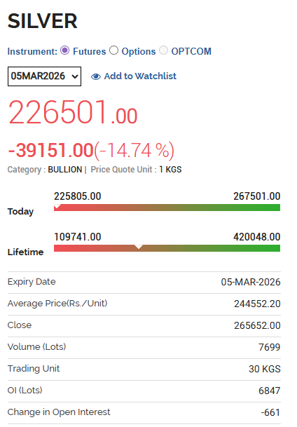 - MCX का हाल: रविवार को विशेष सत्र के दौरान चांदी 9% लुढ़क कर Rs2.65 लाख के स्तर पर आ गई थी।