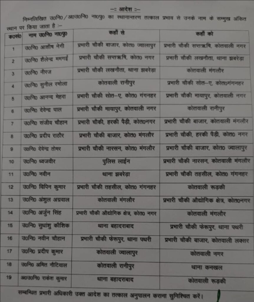 हरिद्वार: जिले में कानून व्यवस्था सुधारने के लिए पुलिस कप्तान ने किया बड़ा फेरबदल, देखिए सूची !