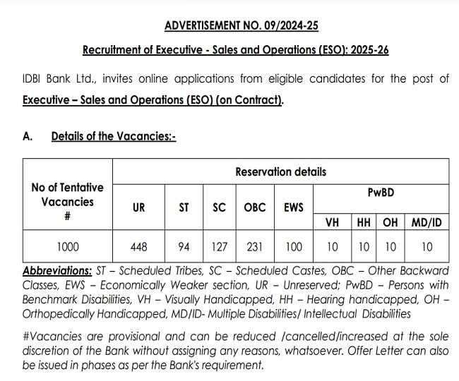 नई दिल्ली : बैंक में नौकरी पाने की तैयारी कर रहे अभ्यर्थियों के लिए एक खुशखबरी है। आईडीबीआई बैंक ने एग्जीक्यूटिव (सेल्स एंड ऑपरेशन) के पदों पर भर्ती के लिए नोटिफिकेशन जारी कर दिया है। इस भर्ती प्रक्रिया की शुरुआत 7 नवंबर 2024 से हो चुकी है और इच्छुक अभ्यर्थी आईडीबीआई बैंक की आधिकारिक वेबसाइट idbibank.in पर जाकर आवेदन कर सकते हैं। आवेदन की अंतिम तिथि 16 नवंबर 2024 तय की गई है, इसलिए अभ्यर्थियों को जल्दी आवेदन करना होगा।