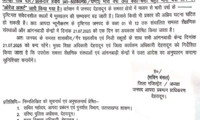 देहरादून: उत्तराखंड में मौसम विभाग और एनडीएमए द्वारा जारी ताज़ा चेतावनी के बाद देहरादून प्रशासन ने एहतियाती कदम उठाते हुए जनपद के सभी शासकीय, गैर-शासकीय एवं...