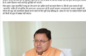 देहरादून: उत्तराखंड सरकार ने सनातन धर्म की आड़ में लोगों को ठगने वाले छद्मवेशधारी फर्जी बाबाओं के खिलाफ सख्त कार्रवाई के संकेत देते हुए “ऑपरेशन कालनेमि”...