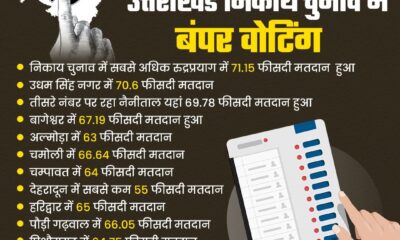 उत्तराखंड : राज्य में आज संपन्न हुए निकाय चुनाव में कुल 65.03 प्रतिशत मतदान हुआ। चुनाव के दौरान राज्यभर के 11 नगर निगम, 43 नगर पालिका...