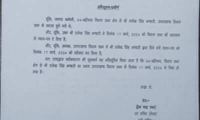 देहरादून। बद्रीनाथ विधनासभा से राजेन्द्र सिंह भंडारी की गई विधायकी। राजेन्द्र सिंह भण्डारी ने दिनांक 17 मार्च, 2024 को विधान सभा की सदस्यता से दिया त्याग-पत्र।...