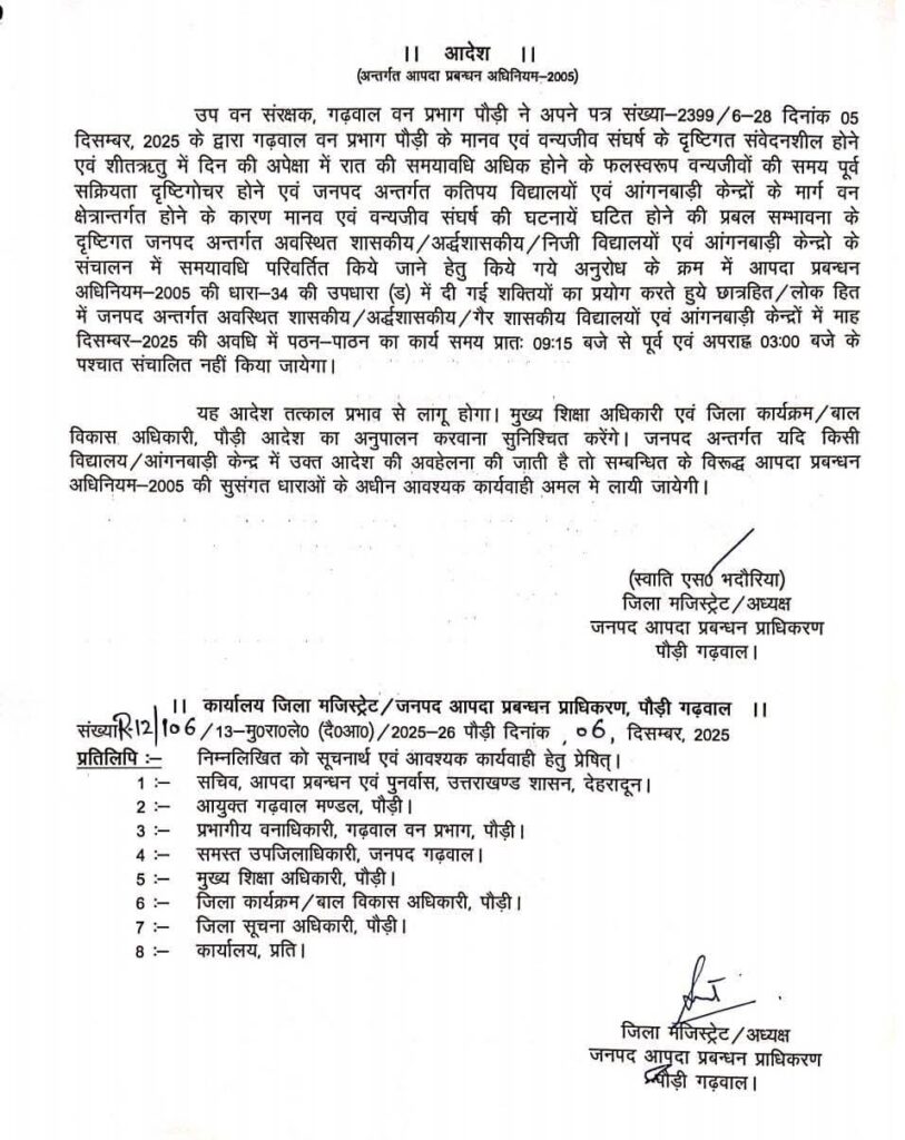 पौड़ी जिलें में वन्यजीव संवेदनशीलता को देखते हुए जिले के विद्यालयों व आंगनबाड़ी केंद्रों के समय में अस्थायी परिवर्तन किया गया है। जिलाधिकारी पौड़ी स्वाति भदौरिया ने आपदा प्रबंधन अधिनियम–2005 की धारा 34(ड) के तहत आदेश जारी किया है।