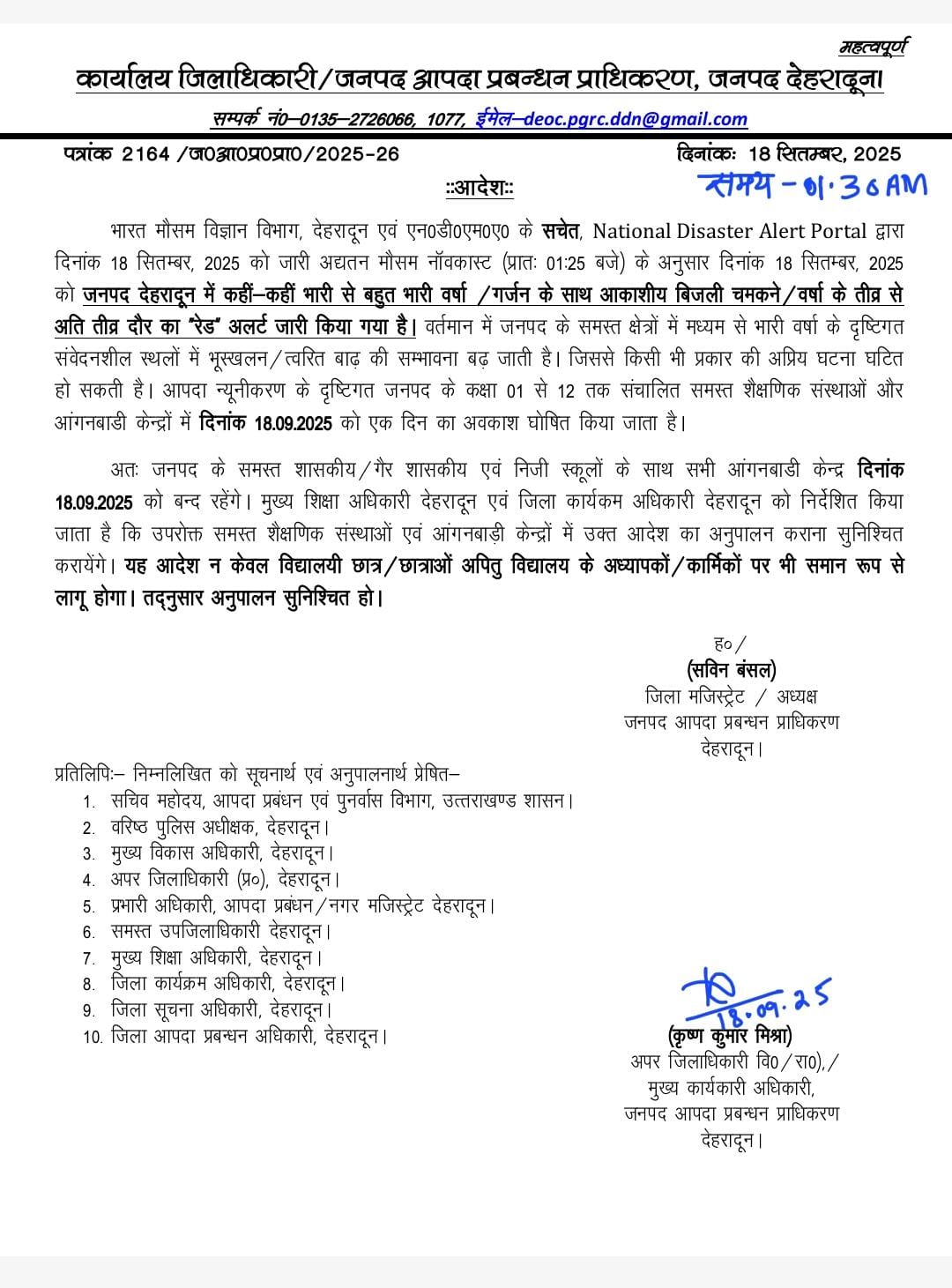 आपदा न्यूनीकरण के दृष्टिगत, जिला प्रशासन ने आदेश जारी करते हुए कहा है कि जनपद देहरादून के समस्त कक्षा 1 से 12 तक के शासकीय, अशासकीय, निजी स्कूल एवं सभी आंगनबाड़ी केंद्रों में आज दिनांक 18.09.2025 को एक दिवसीय अवकाश रहेगा।