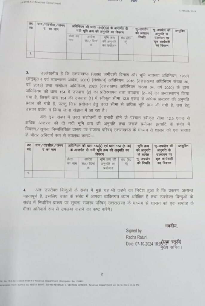 राजस्व परिषद् उत्तराखंड द्वारा जारी आदेश में कहा गया है कि सभी संबंधित अधिकारियों को एक सप्ताह के भीतर इस संबंध में जानकारी उपलब्ध कराने के लिए कहा गया है। इस आदेश के अनुसार, यदि किसी क्रेता ने स्वीकृत सीमा 12.5 एकड़ से अधिक भूमि क्रय की है और उसका उपयोग निर्धारित प्रयोजन के लिए नहीं किया है, तो उस पर विवरण तैयार किया जाना चाहिए।