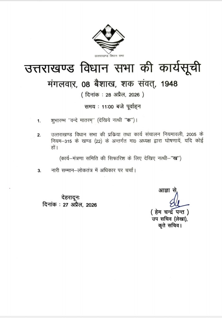 उत्तराखंड विधानसभा में 28 अप्रैल को ‘नारी सम्मान, लोकतंत्र में अधिकार’ विषय पर एक दिवसीय विशेष सत्र आयोजित किया जाएगा। इस सत्र में महिलाओं के अधिकारों, उनकी भागीदारी और लोकतांत्रिक व्यवस्था में उनकी भूमिका जैसे महत्वपूर्ण मुद्दों पर चर्चा की जाएगी।