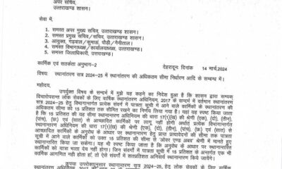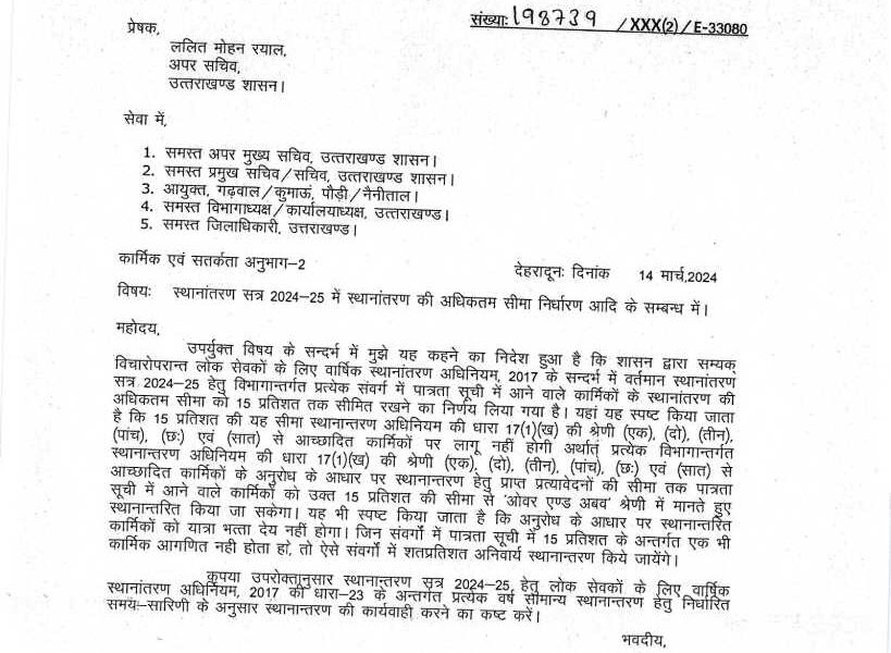 स्थानांतरण सत्र 2024-25 में स्थानांतरण की अधिकतम सीमा निर्धारण आदि के सम्बन्ध में। उपर्युक्त विषय के सन्दर्भ में मुझे यह कहने का निदेश हुआ है कि...