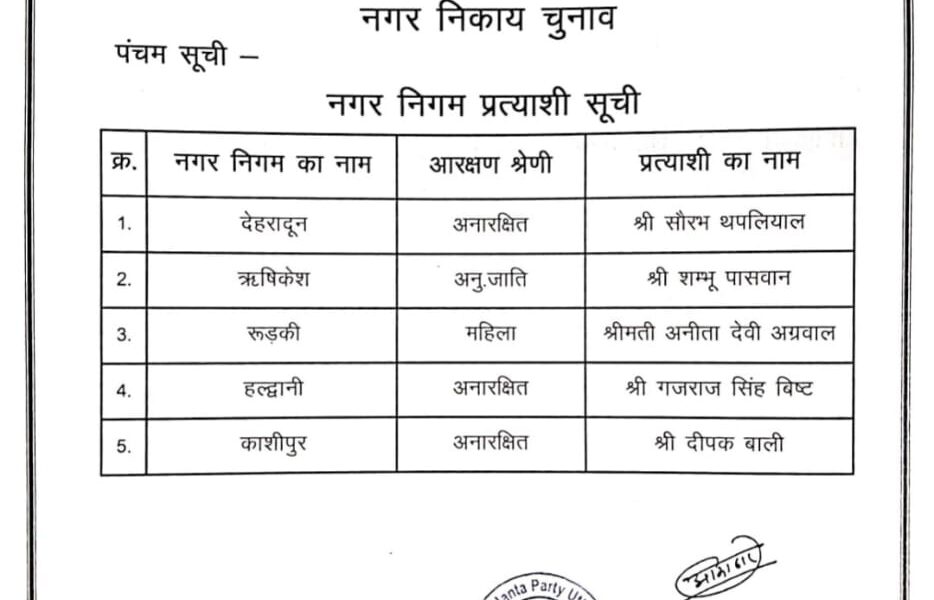 देहरादून : भारतीय जनता पार्टी उत्तराखंड ने आगामी नगर निकाय चुनावों के लिए प्रत्याशियों की पंचम सूची जारी कर दी है। इस सूची में देहरादून मेयर...
