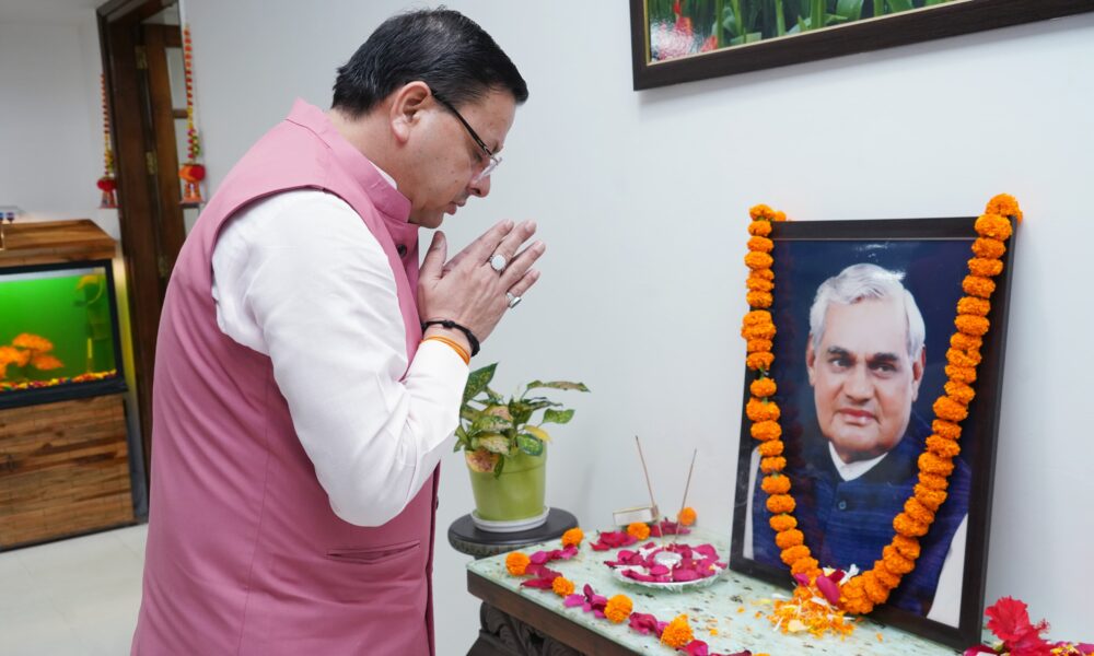 मुख्यमंत्री पुष्कर सिंह धामी ने पूर्व प्रधानमंत्री स्वर्गीय अटल बिहारी वाजपेयी की पुण्य तिथि पर उनके चित्र पर श्रद्धा सुमन अर्पित कर दी श्रद्धांजलि।