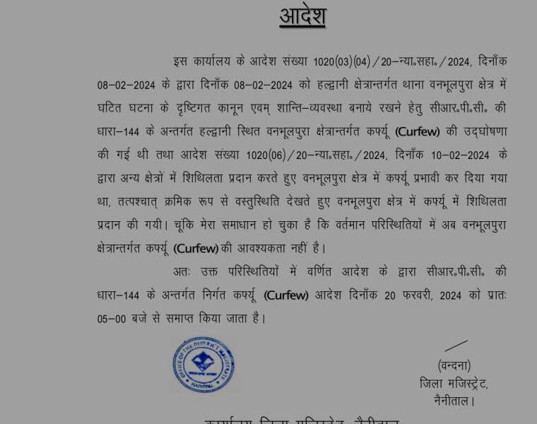 देहरादून – हल्द्वानी- बनभूलपुरा क्षेत्र से हटाया गया कर्फ्यू सुबह 5 बजे से बनभूलपुरा में नही रहा कर्फ्यू प्रभावी जिलाधिकारी वंदना सिंह ने जारी किया आदेश...
