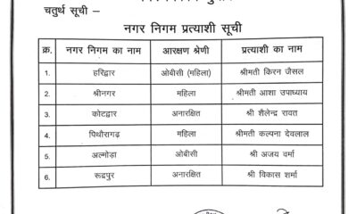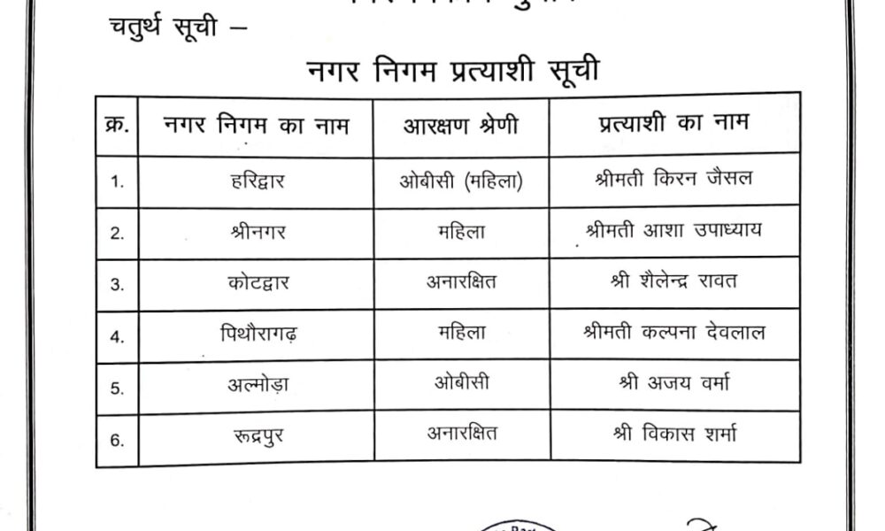 देहरादून: भाजपा ने महापौर के पद के लिए उम्मीदवारों की सूची जारी की। पार्टी ने 6 नगर निगमों के प्रत्याशियों की घोषणा की है। घोषित उम्मीदवारों...