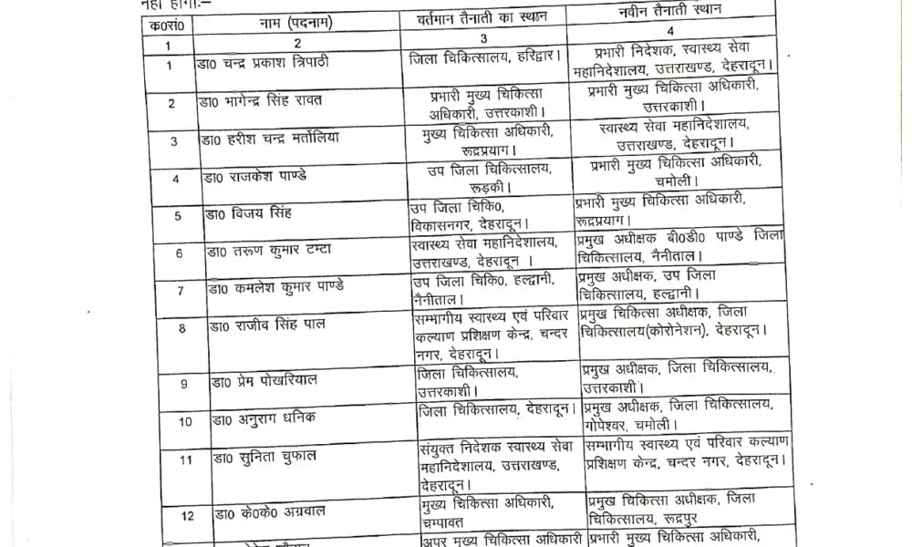 देहरादून – उच्च स्तर पर स्वास्थ्य विभाग में हुआ बड़ा उलटफेर, आदेश जारी। प्रभारी निदेशक/प्रभारी निदेशक एन०एच०एम०/ प्रभारी मुख्य चिकित्साधिकारी / प्रमुख अधीक्षक / मुख्य चिकित्सा...