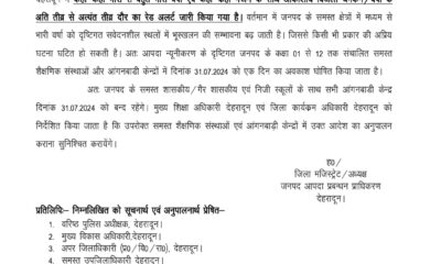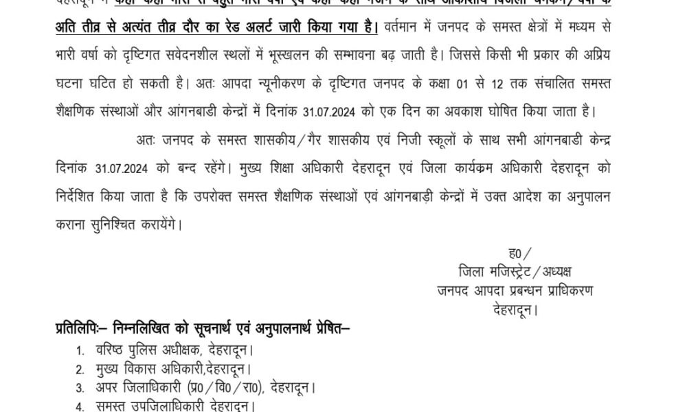 देहरादून ब्रेकिंग। 31 जुलाई को सभी स्कूल और आंगनबाड़ी केंद्र रहेंगे बंद, आदेश जारी। देहरादून जिले में भारी बारिश की जताई आशंका। उत्तराखंड में एक बार...
