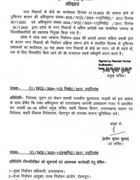 देहरादून – उत्तराखंड के सभी नगर निगम, नगर पालिका और नगर पंचायतों का कार्यकाल शुक्रवार को पूरा हो रहा है। शनिवार से सभी निकायों में प्रशासक...