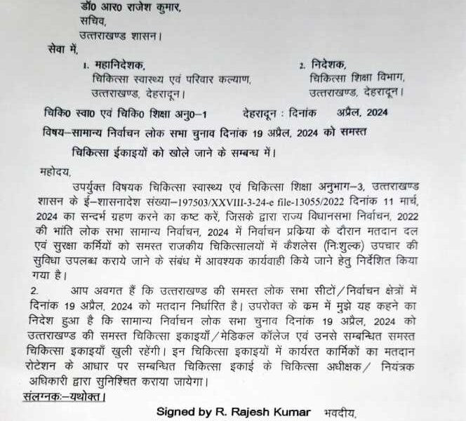देहरादून – उपर्युक्त विषयक चिकित्सा स्वास्थ्य एवं चिकित्सा शिक्षा अनुभाग-3, उत्तराखण्ड शासन के ई-शासनादेश संख्या-197503/XXVIII-3-24-e file-13055/2022 दिनांक 11 मार्च, 2024 का सन्दर्भ ग्रहण करने का कष्ट...