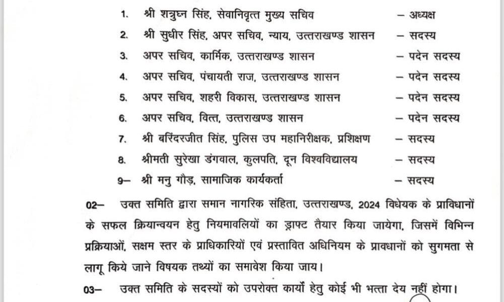 UCC को लागू करने के लिए नियमावली होगी तैयार, पूर्व मुख्य सचिव शत्रुघ्न सिंह की अध्यक्षता में 9 सदस्यीय कमेटी गठित।