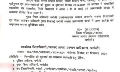 चमोली: भारत मौसम विज्ञान विभाग, मौसम विज्ञान केन्द्र देहरादून द्वारा जारी पूर्वानुमान के अनुसार, 28 दिसंबर 2024 को उत्तराखंड राज्य के विभिन्न जनपदों के साथ-साथ चमोली...