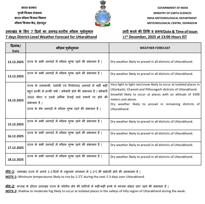 इन जिलों में बर्फबारी 3500 मीटर व उससे अधिक ऊँचाई वाले स्थानों पर होने की संभावना है। जबकि राज्य के अन्य जिलों में मौसम शुष्क रहने की संभावना है।