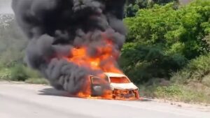 हाईवे पर चलती कार में आग लगने से मची अफरा तफरी, कार में सवार लोगों ने भागकर बचाई अपनी जान।