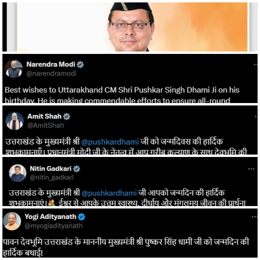“मुख्यमंत्री पुष्कर सिंह धामी को जन्मदिन की ढेरों शुभकामनाएँ। वे उत्तराखंड के विकास के लिए समर्पित भाव से कार्य कर रहे हैं। उनके आने वाले वर्षों के लिए मेरी शुभकामनाएँ।”