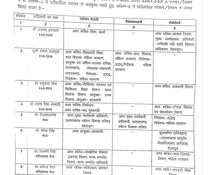 देहरादून। उत्तराखंड शासन ने सोमवार को प्रशासनिक स्तर पर बड़ा फेरबदल करते हुए चार IAS और दो PCS अधिकारियों समेत कुल 11 अधिकारियों के कार्यक्षेत्र में...